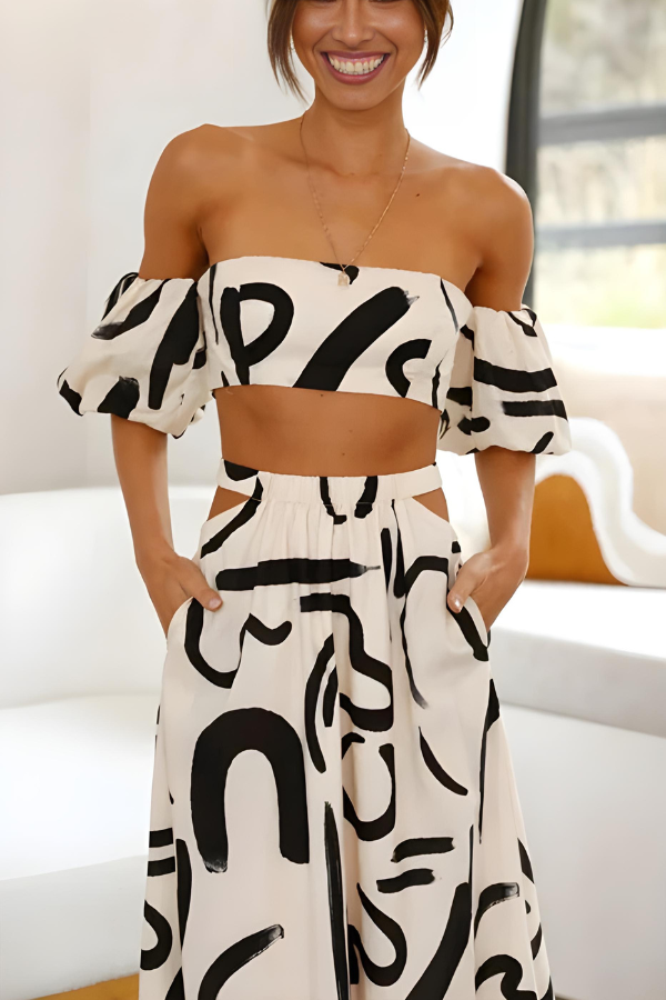 Kliva in i rampljuset med Camilla Set, din ultimata outfit för ett djärvt modeuttalande. Med ett slående abstrakt tryck och en unik design, kombinerar detta tvådelade set stil och komfort på ett enkelt sätt. Den off-the-shoulder crop topen tillsammans med den flödande maxikjolen skapar en chic, modern look, perfekt för alla tillfällen där du vill sticka ut och känna dig självsäker.